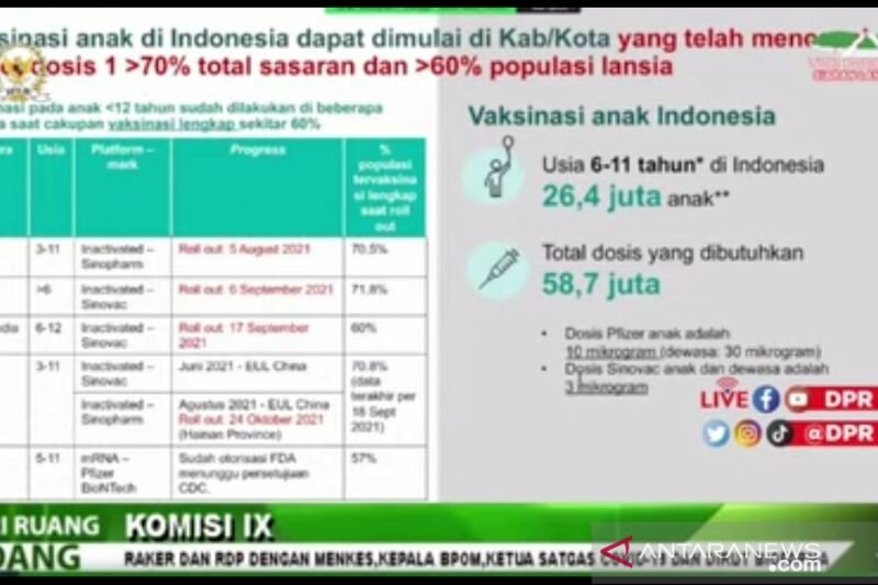 “Vaksin untuk usia anak 6 sampai 11 tahun itu ada 26,4 juta, jadi mungkin ada butuh tambahan 58,7 juta yang ini juga belum ada dianggaran kita,” kata Menteri Kesehatan RI Budi Gunadi Sadikin dalam Rapat Dengar Pendapat (RDP) Komisi IX yang diikuti dari YouTube DPR RI di Jakarta, Senin.