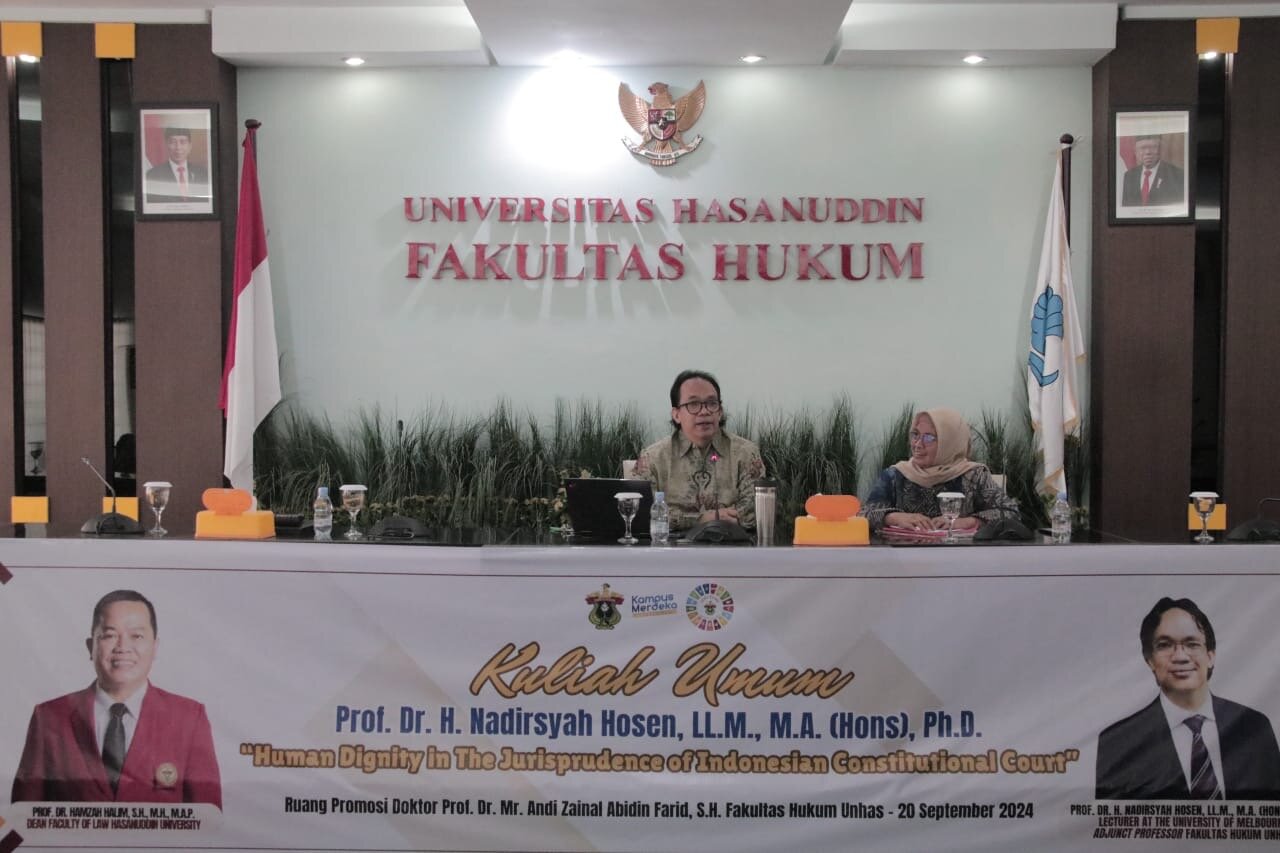 www.beritamakassar.com  – Fakultas Hukum Universitas Hasanuddin (FH Unhas) menyelenggarakan kuliah umum bertajuk “Human Dignity in The Jurisprudence of Indonesian Constitutional Court” pada Jumat (20/09/2024). Acara ini menghadirkan Prof. Dr. H. Nadirsyah Hosen, LL.M., M.A. (Hons), Ph.D., akademisi Indonesia yang mengajar di Universitas Melbourne, Australia, sekaligus Adjunct Professor FH Unhas. Kuliah umum ini diikuti sekitar 120 mahasiswa yang mengambil mata kuliah Hukum Tata Negara secara langsung di Ruang Promosi Doktor Prof. Dr. Mr. Andi Zainal Abidin Farid, S.H.